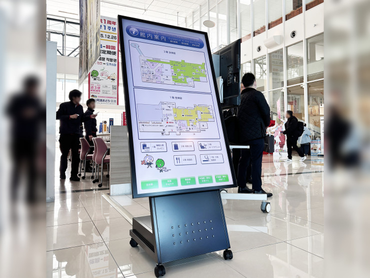 また、エントランスロビーのエスカレーター横には、タッチパネル式のデジタルサイネージも設置させていただきました。
