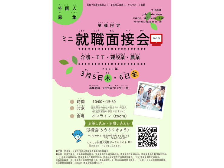 徳島県労働福祉協議会では、在住外国人を対象としたオンライン就職面接会を開催。